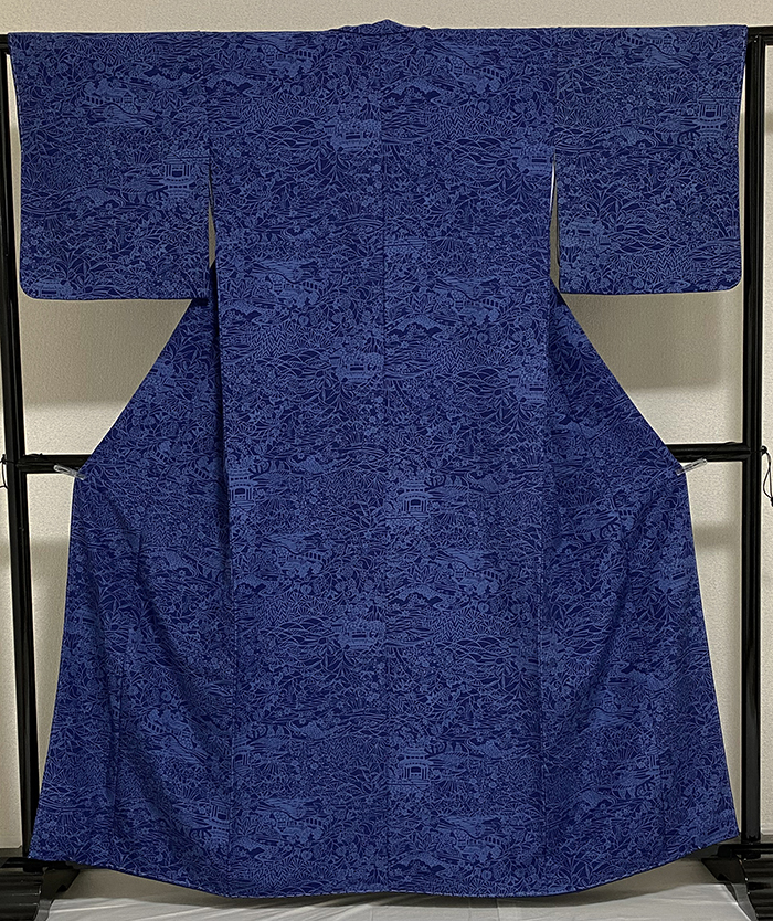 しなやかな手触りの一越の生地をくすんだ紺色に地染めし、花や家などの柄を薄い地色で重ね染めした品。八掛けは正絹緑みの紺色無地で胴裏は正絹が付いた手縫い仕立て。
