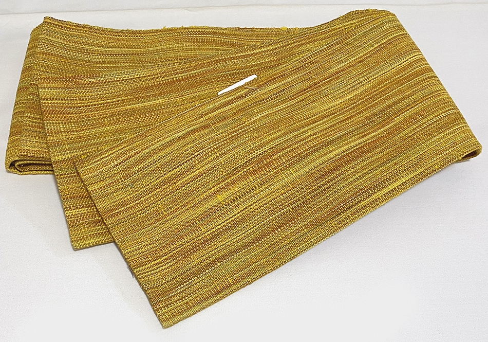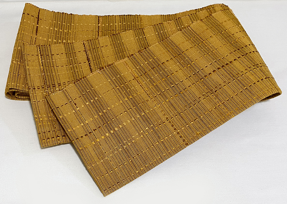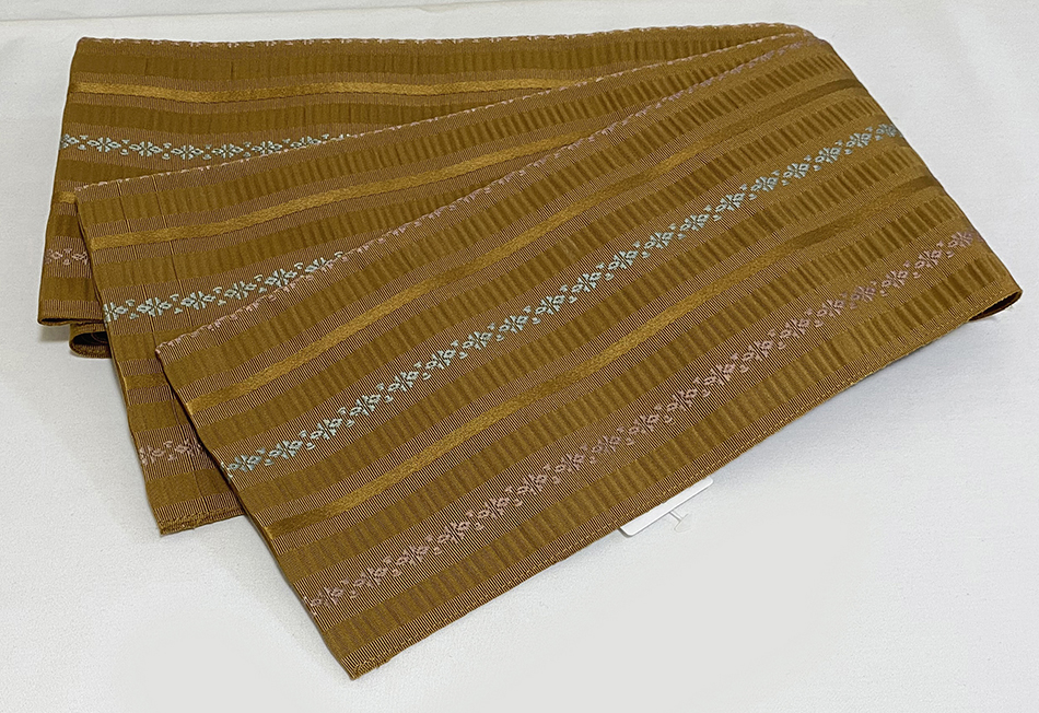 しなやかな手触りで小さなフシを織り込んだくすんだ金茶の紬地織りに、横段縞柄をくすんだ金茶濃淡に少しのエンジ色を加え重ね織りした品。丸帯仕立て。