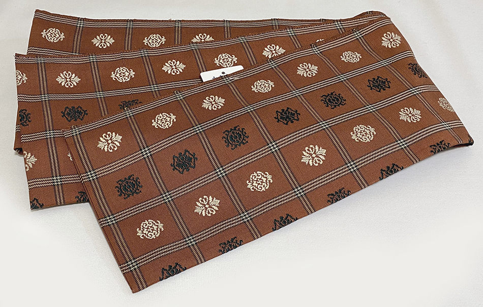 張りのある手触りで細糸で確りと打ち込まれた茶色の紬地織りに、格子と抽象柄を白ネズや緑色など重ね織りした品。丸帯仕立て。