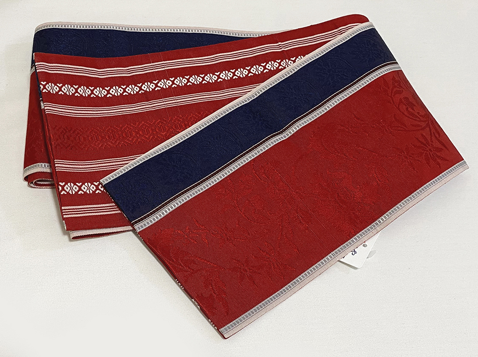 張りのある手触りで細糸で確りと打ち込まれた紺と紅色・薄いグレーの織り分けの本袋博多織り地織りに、花柄を地色で重ね織りした品。 裏面は、縞献上の柄を紅色と白で重ね織りした品。
