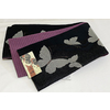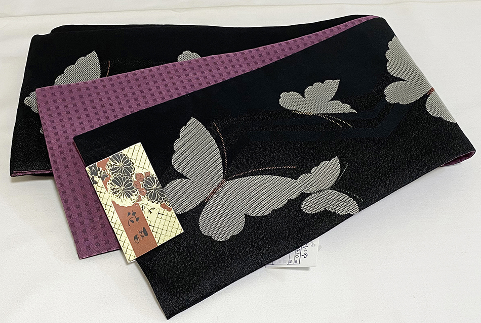しなやかな手触りで小さな地柄を織り込み、ヨロケ縞の地柄を織り込んだ黒のポリエステル錦の地織りに、蝶柄を白ネズと赤紫・薄緑色で重ね織りした品。