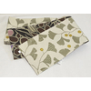 しなやかな手触りでベージュ色のポリエステル錦の地織りに、羽柄を緑みのベージュ色と金茶で重ね織りした品。 裏面は、こげ茶に地織りし、葉柄をベージュ色や紫・くすんだピンク色などで重ね織りした品。