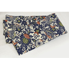 しなやかな手触りの木綿生地をベージュ色に地染めし、花などの柄を鉄紺や海老茶に抹茶色などで重ね染めした品。