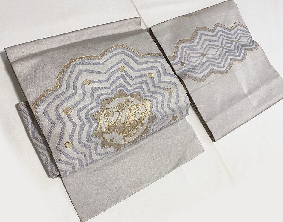 しなやかな手触りで確りと打ち込まれたグレーの錦の地織りに、お太鼓の鳳凰の柄を地色濃淡と金糸金箔で重ね織りした、お太鼓柄の品。
