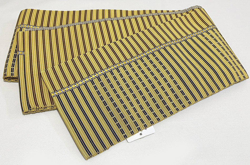 張りのある手触りで細糸で確りと打ち込まれた金茶の錦地織りに、横段縞柄を鉄紺やエンジ色で重ね織りした品。裏面は、表と同じ地織りで、縞柄を金茶・エンジ色などで重ね織りした品。