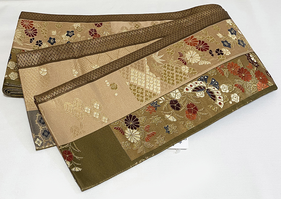 張りのある手触りで確りと打ち込まれたベージュ色とくすんだウグイス色の織り分けに金糸を重ねた錦地織りに、花鳥柄を金糸金箔にエンジ色や青色や白ネズなどで重ね織りした品。 裏面は、ベージュ色やグレーの織り分けに金糸を重ねた錦地織りに、亀甲や小花などの柄を金糸や白・黄赤などで重ね織りした品。