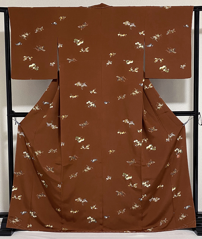 張りのある手触りで確りと打ち込まれた変わり一越の生地をくすんだ黄赤色に地染めし、花柄を緑色や青ネズに少しの金彩を加え重ね染めした品。八掛けは正絹くすんだ黄赤色無地で胴裏は正絹が付いた手縫い仕立て。パールトーン加工済み、下前衿先裏にタグがあります。花井幸子作、下前オクミに作家落款があります。