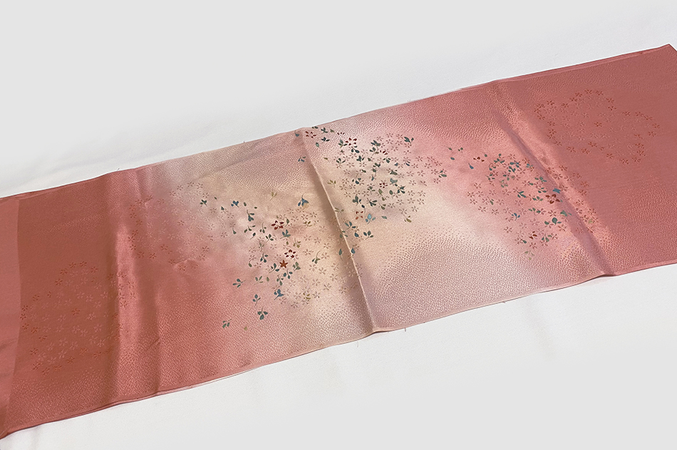 しなやかな手触りの縦縞をフクレ織りで重ね、花の地柄を織り込んだ紋綸子の生地を藤ローズ色濃淡に地染めし、花びらの柄を黄赤色や紫色などで重ね染めした品。