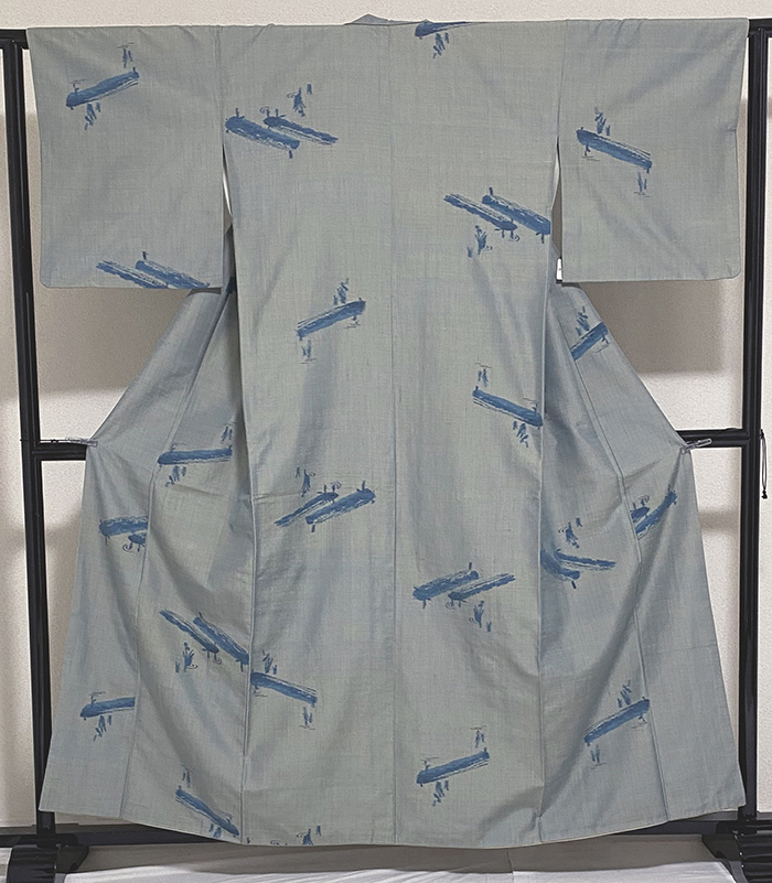張りのある手触りで確りと打ち込まれ横糸にフシ糸を織り込んだベージュ色に淡い青色で重ね織りした紬の地織りに、浮橋の様な柄をくすんだ青色濃淡で重ね織りした品。八掛けは正絹くすんだベージュ色無地で胴裏は正絹が付いた手縫い仕立て。