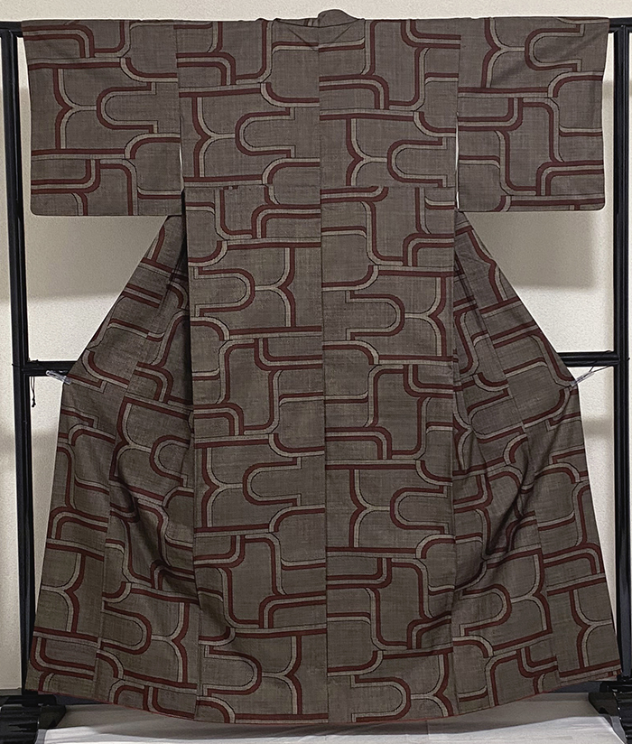 張りのある手触りで細糸で確りと打ち込まれた深い小豆色の大島紬の地織りに、幾何学模様の柄をエンジ色と白ネズなどで重ね織りした品。八掛けは正絹エンジ色無地で胴裏は正絹が付いた手縫い仕立て。