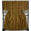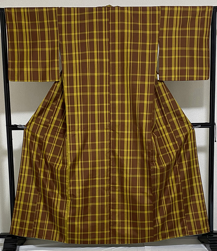 スベリの良い手触りで細糸で確りと打ち込まれたくすんだ黄色の平紬の地織りに、格子柄を茶色で重ね織りした品。八掛けは正絹薄緑色暈しで胴裏は正絹が付いた手縫い仕立て。衿裏にはホック代わりに糸が付いています。