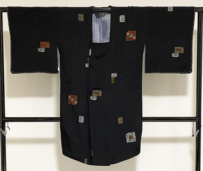 |  | しなやかな手触りの花の地柄を織り込み、四角取り花柄をエンジ色の漆糸と銀糸に薄茶などで織り込んだ紋意匠の生地を黒で染め上げた品。裏地は正絹が付き、四角柄を薄ネズ濃淡で染めた品です。