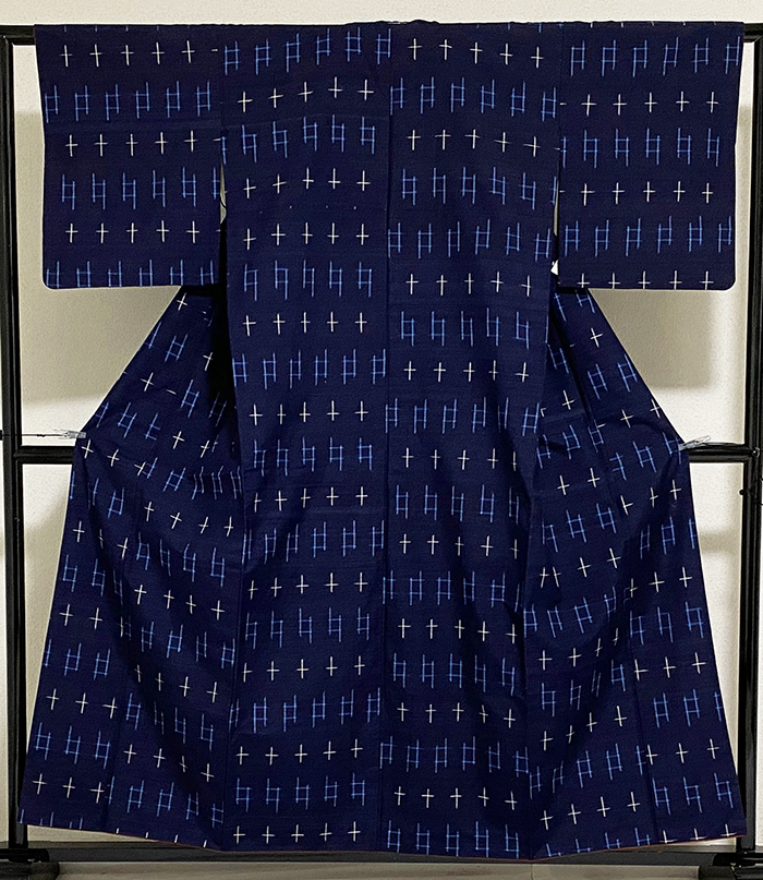 しなやかな手触りの小さなフシを織り込んだ紬織り生地で、深い紺色に地織りし、大きな絣柄を白と青色で織った品。八掛けは正絹エンジ色無地で胴裏は正絹が付いた手縫い仕立て。衿裏にはホック代わりに糸が付いています。