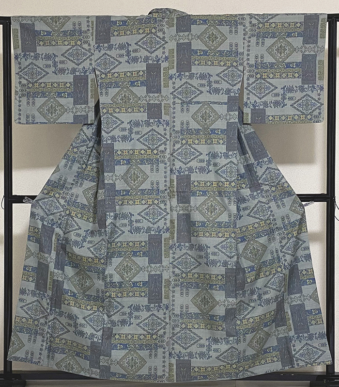 しなやかな手触りの良い紬織り生地で、青ネズ色の地織りに、白で絣で織り、その上の横段抽象柄を鉄紺色や金茶色に少しの黄赤色を加えて織った品。八掛けは正絹くすんだ青磁色無地で胴裏は正絹が付いた手縫い仕立て。衿裏にはホック代わりに糸が付いています。