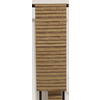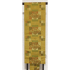 しなやかな良い手触りの綾で無地織りに織った濃いベージュ色の地織りに、四角取り家や庭などの柄を小豆色に少しの黄赤色と緑色を加えて織った品。