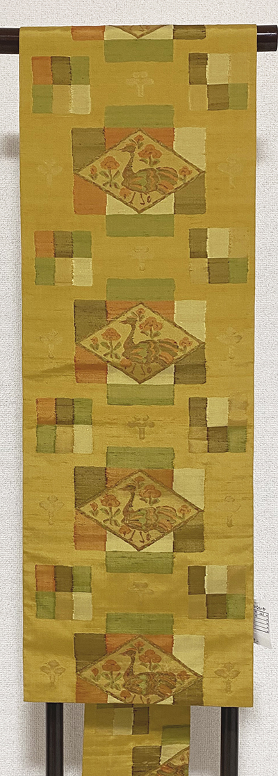 しなやかな良い手触りの小さなフシを織り込んだ紬織り生地で、くすんだ金茶色の地織りに、四角と花鳥柄をモスグリーン色や黄赤色などで織った品。