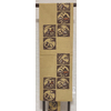確りとした良い手触りのくすんだ金茶色地織りに、横段幾何学文様の柄を黄赤色と少しの青緑色を加えて織った品。