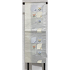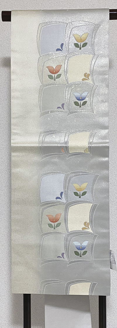 しなやかなとても手触りの良い錦の織りで、白ネズ色の地織りに金銀糸を霜降りに織り込み、その上の四角と花柄を青色や緑色に薄紫色と黄赤色を加え織った、三通柄の品。