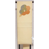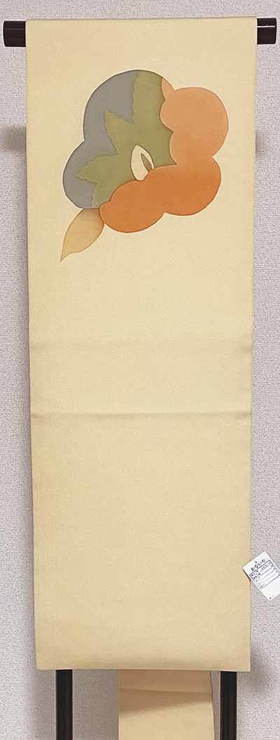しなやかな良い手触りの塩瀬の生地を優しい薄オレンジ色に染め、お太鼓の花柄を青紫やウグイス色にオレンジ色などで手書きに染めた品。