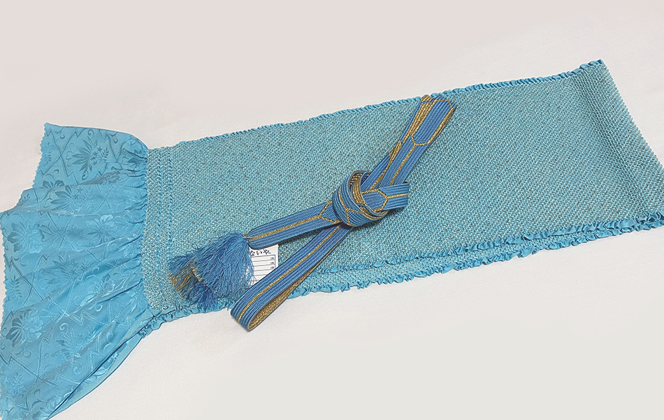 帯締めは、2センチ幅の平組みで、水色と金糸で組み上げた品。