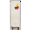 しなやかな張りのある上質な塩瀬の生地で、生成りのベージュ色に染め、お太鼓の花柄を青色や山吹色に紅梅色などの濃淡で染めた品。タレ上に作者落款があります。 裏地は桃色のきれいな色に染めた品が付いています。