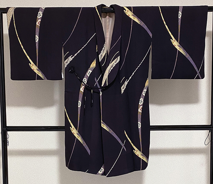しなやかな良い手触りの縦にヨロケに織り上げた紋意匠織り生地で、黒に近い紫色の地色に染め、縦に流れる熨斗目や花柄を薄紫色にベージュ色や金茶色などで染めた品。裏地は正絹が付き、淡い薄ローズ色暈しに染めた品です。別生地の飾り紐が付いています。
