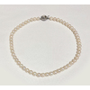 淡いピンク色がかったアコヤ貝真珠の品。金属の留め金が付いています。ネックレスと同じサイズの玉が付いたイヤリングが付いています。