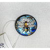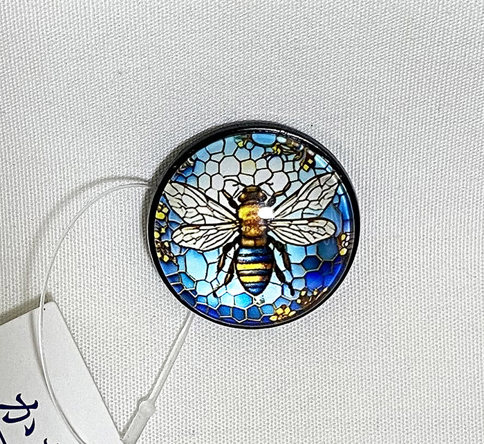 プラスチックの台に、蜂の柄を埋め込んだ丸いレンズの品。三分紐用。