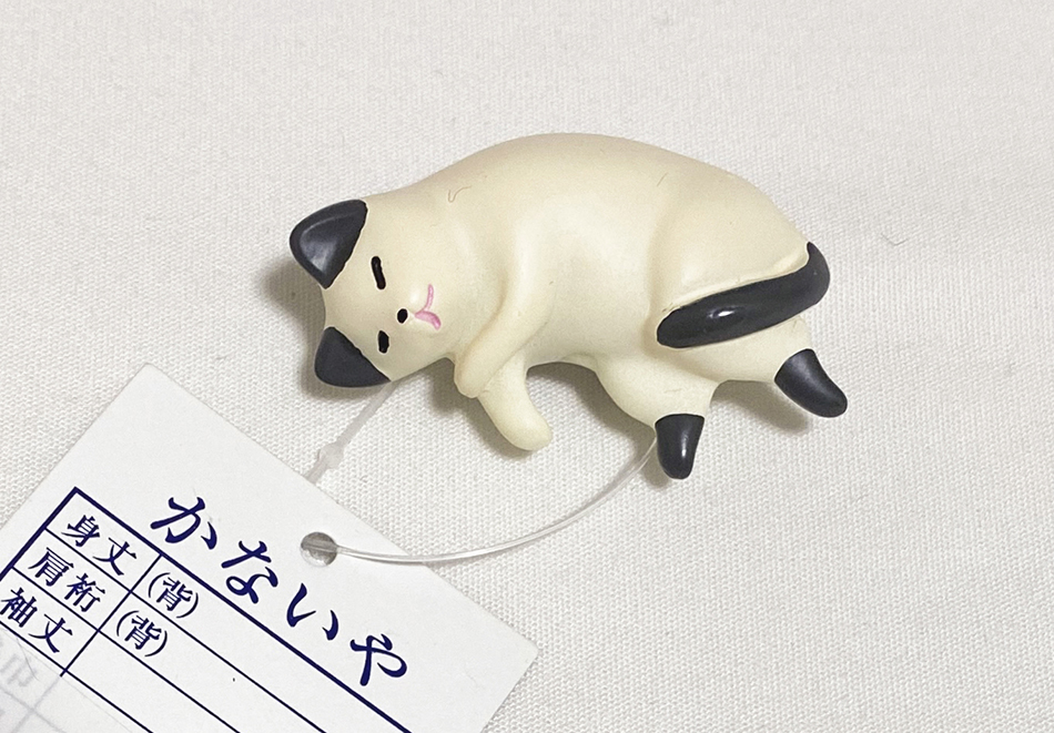 硬い白い石を猫の形に細工し、生成りと黒などで色を加え描いた品。二分紐用。 楕円形の紐を通す口金は大きめで、幅が1センチで厚みが5ミリあります。