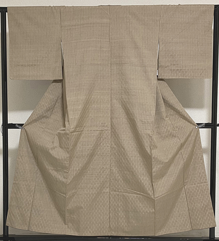 確りとした張りのある小さなフシを織り込んだ紬織り生地で、くすんだ薄茶色の地織りに、ヨロケ縞の柄を薄緑色やエンジ色などで織った品。八掛けは正絹渋いウグイス色無地で胴裏は正絹が付いた手縫い仕立て。衿裏にはホック代わりに糸が付いています。