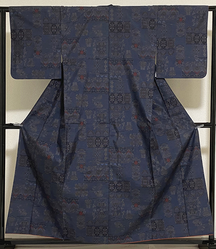しなやかなスベリの良い大島紬織り生地で、深い紺色濃淡に地織りに、花柄をベージュ色や赤紫色にエンジ色などを加えて織った品。八掛けは正絹の鮮やかな黄赤色無地で胴裏は正絹が付いた手縫い仕立て。