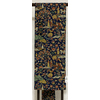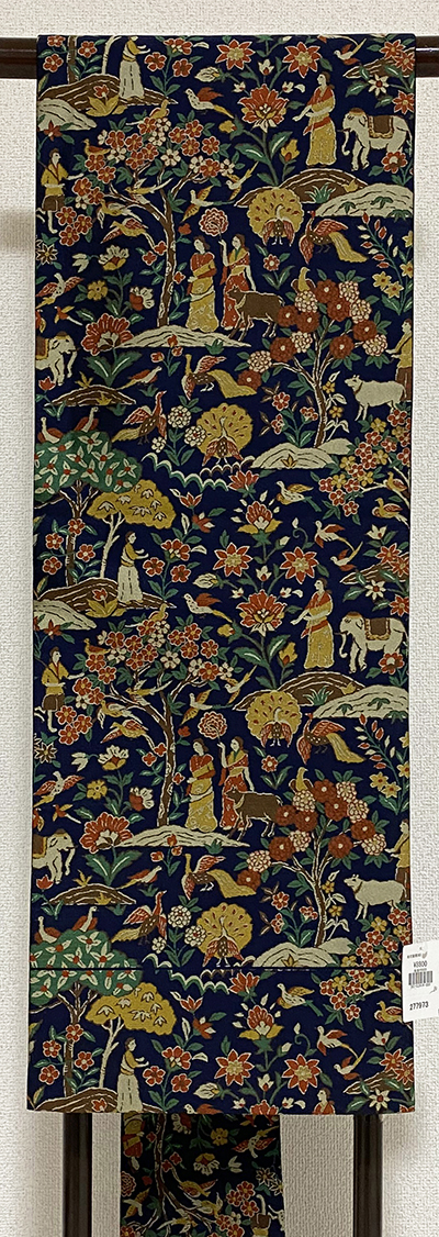 確りとした細糸で織り込まれた紹巴織りで、深い紺色の地織りに、花鳥柄に人や動物などの柄を加え、黄赤色や金茶色に緑色などで織った品。