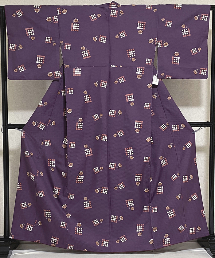 しなやかな手触りの良い小さな四角柄を織り込んだポリエステル紋織り生地で、赤紫色の地色に、小花や四角柄を白や金茶色に薄緑色などを加え染めた品。八掛けはポリエステルエンジ色無地で胴裏もポリエステルが付いています。ミシン縫い仕立て。