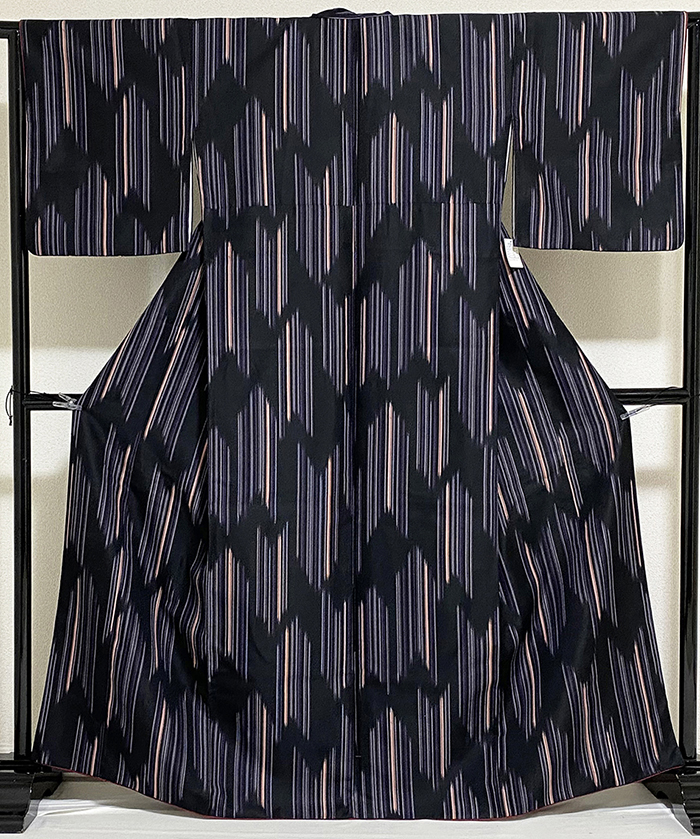 しなやかな手触りの小さな霜降り地織りのポリエステル生地で、黒の地色に、細縞を重ねた矢羽根の柄を珊瑚色や薄紫色濃淡で染めた品。八掛けはポリエステルエンジ色無地で胴裏もポリエステルが付いています。ミシン縫い仕立て。