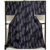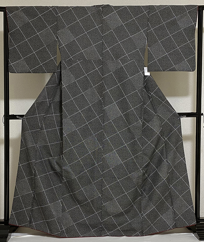 薄手でしなやかな手触りのポリエステル一越織り生地で、黒の地色に、白で大きな四角柄を染め、その中に小花の柄を白で染めた品。八掛けはポリエステルエンジ色無地で胴裏もポリエステルが付いています。ミシン縫い仕立て。