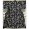 しなやかな手触りの小さな霜降り柄を織り込んだポリエステル生地で、黒の地色に、白の鹿の子柄で牡丹の花などの柄を染めた品。八掛けはポリエステルエンジ色無地で胴裏もポリエステルが付いています。ミシン縫い仕立て。