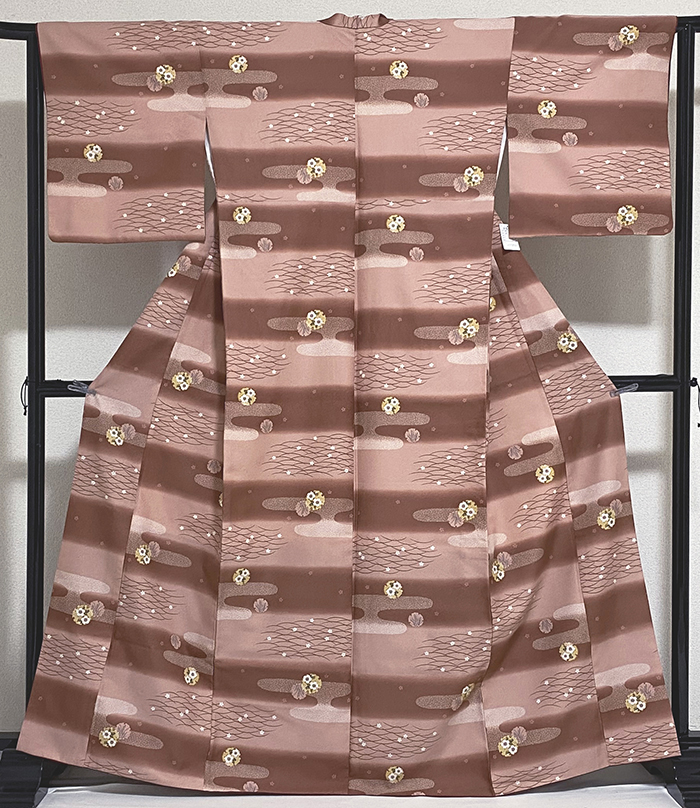 しなやかな張りのある小さな霜降り柄を織ったポリエステル綸子生地で、少しのエンジ色が加わったローズ色濃淡の横段に染め、その上の露芝や小花の柄を金茶色や白に少しの緑色を加えて染めた品。八掛けはポリエステルエンジ色無地で胴裏もポリエステルが付いています。ミシン縫い仕立て。