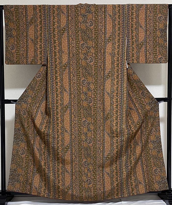 しなやかで光沢のあるポリエステル綸子生地で、太い縞に花などの柄を鉄紺色濃淡と金茶色に黄赤色などで染めた品。八掛けはポリエステルくすんだ金茶色無地で胴裏もポリエステルが付いています。手縫い仕立て。