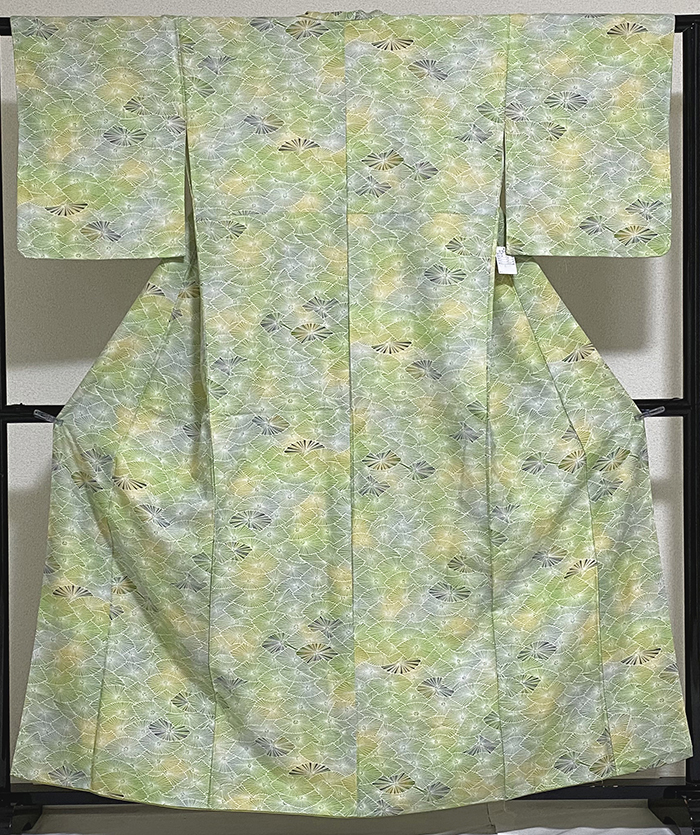 しなやかな手触りのポリエステル綸子織り生地で、薄緑色と金茶色濃淡の地色に、扇の柄に白と紫色や金茶色などを加えて染めた品。八掛けはポリエステルのウグイス色暈しで胴裏もポリエステルが付いています。手縫い仕立て。