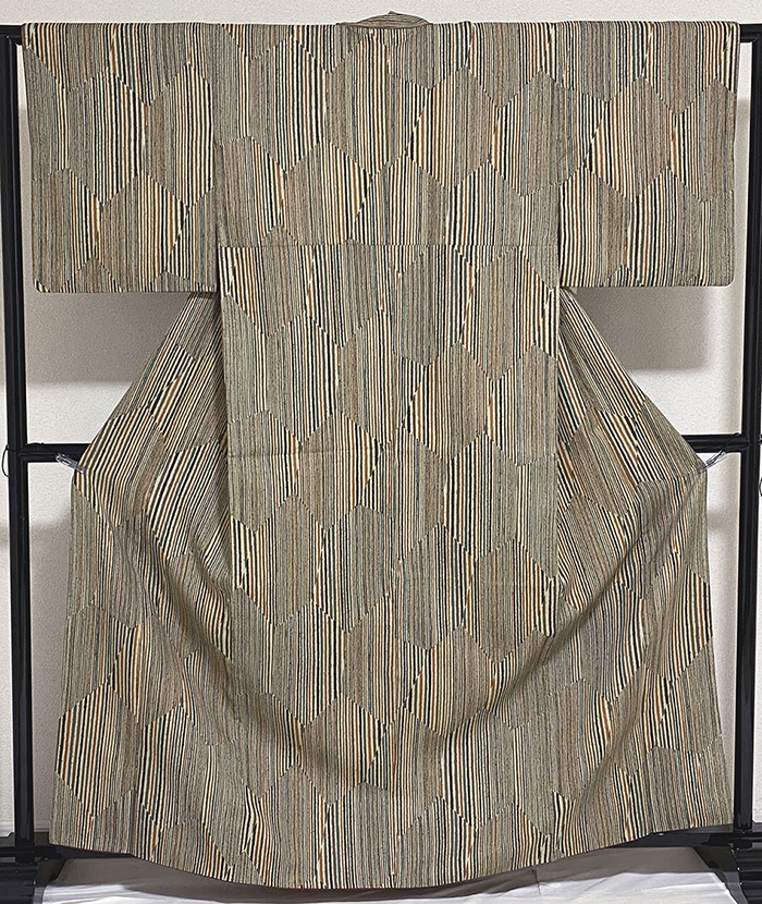 しなやかな手触りのポリエステル生地で、くすんだベージュ色の地色に、大きな亀甲や細縞の柄を黄赤色や鉄紺色にウグイス色と薄紫色を加え染めた品。八掛けはポリエステル鮮やかなエンジ色無地で胴裏もポリエステルが付いています。ミシン縫い仕立て。