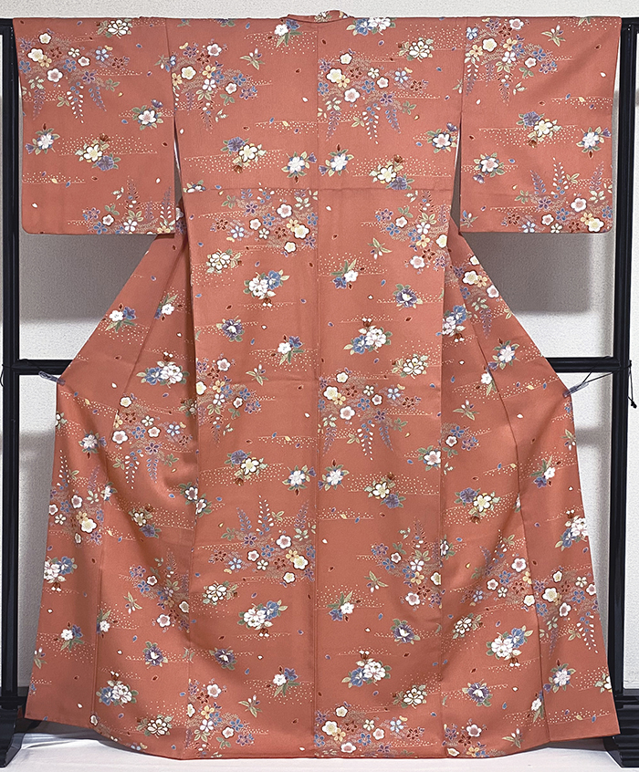 確りとした良い手触りの縦に流れるポリエステル生地で、ピンク色が少し加わった濃いめのサーモン色の地色に、花柄を白や青ネズ色に薄緑色やエンジ色にほんの少しの金彩を加えて染めた品。八掛けはポリエステル黄赤色暈しで胴裏もポリエステルが付いています。手縫い仕立て。