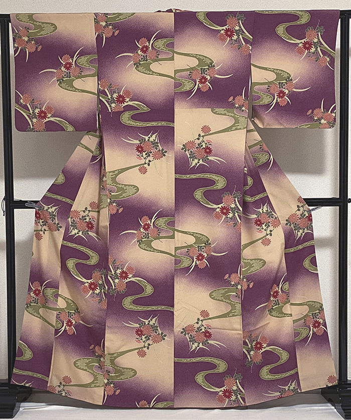 しなやかな良い手触りのポリエステル一越織り生地で、赤紫色とベージュ色で暈しに染め、その上の花柄をウグイス色やエンジ色などを加えて染めた品。八掛けはポリエステルエンジ色暈しで胴裏もポリエステルが付いています。ミシン縫い仕立て。さんび謹製、下前衿先裏にタグがあります。