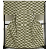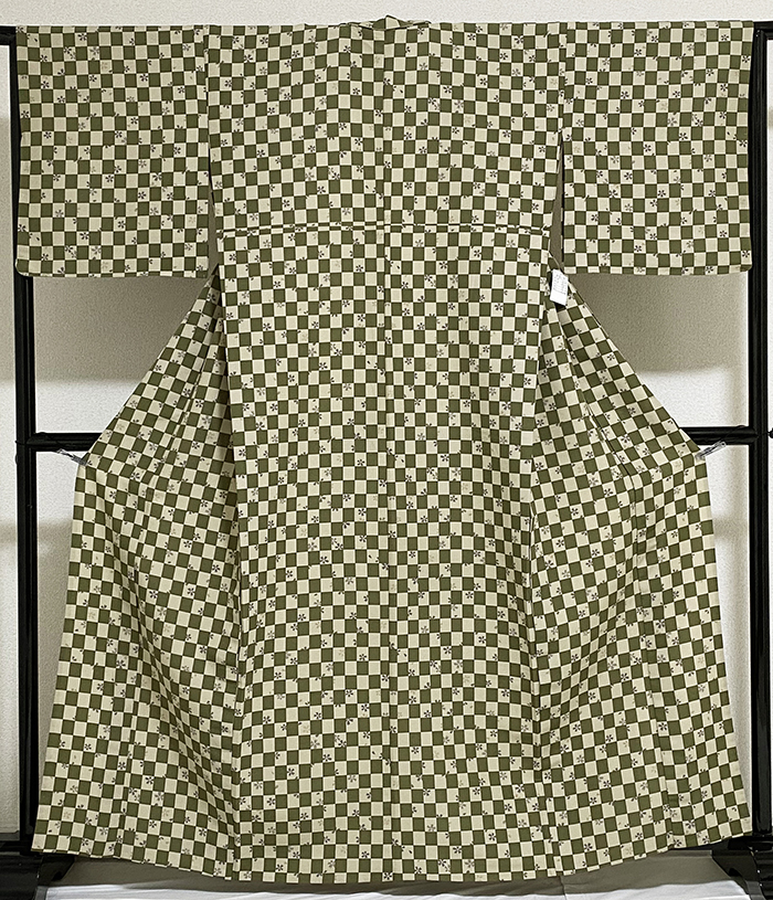 スベリの良い変わり一越ポリエステル織り生地で、ベージュ色と深いウグイス色で市松に染め、その中に小花の柄を紫色や薄茶色で染めた品。背伏せは共生地返しで、ポリエステル白の衿裏が付いたミシン縫いの単衣仕立て。