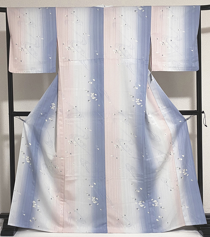 光沢のある細縞を織り込んだポリエステル生地で、青ネズ色と薄珊瑚色で縦暈しに染め、その上の流水花柄を少しの薄緑色を加え染めた品。背伏せは共生地返しで、ポリエステル白の衿裏が付いたミシン縫いの単衣仕立て。