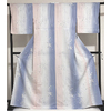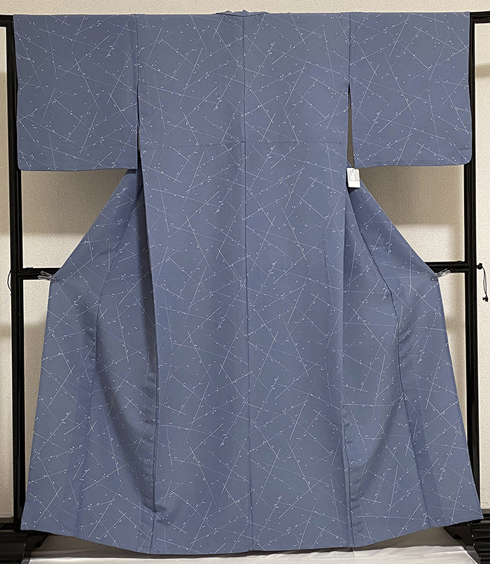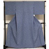 薄手でスベリの良いポリエステル一越織り生地で、くすんだ水色の地色に、斜線とアラレ柄を薄紫色にベージュ色と白やエンジ色などを加え染めた品。背伏せは共生地返しで、ポリエステル白の衿裏が付いたミシン縫いの単衣仕立て。