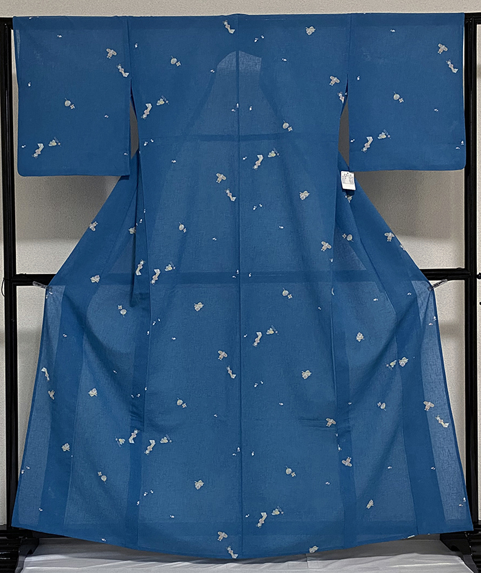 スベリの良い小さな格子柄を織り込んだ透け感のある平織りポリエステル織り生地で、緑みのくすんだ紺色の地色に、横段花などの柄を白ネズ色と薄紫色を加え染めた品。背伏せはポリエステル別生地が付き、ポリエステル白絽の衿裏が付いた手縫いの単衣仕立て。