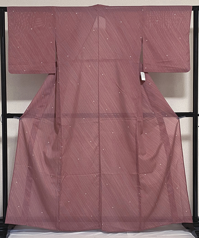 スベリの良い駒絽のポリエステル生地で、くすんだローズ色の地色に、斜めの柄を白ネズ色や青磁色などで染めた品。背伏せは共生地返しで、ポリエステル白絽の衿裏が付いたミシン縫いの単衣仕立て。