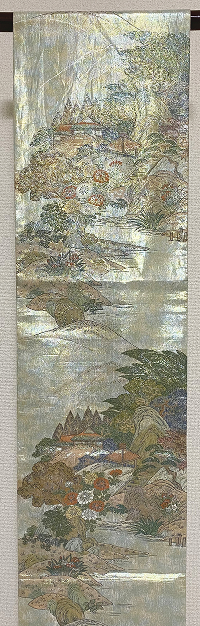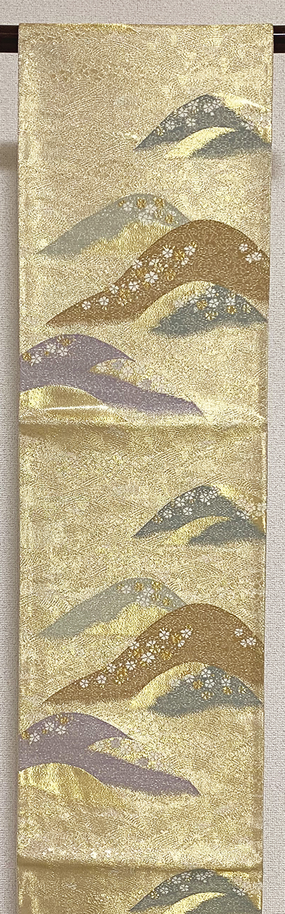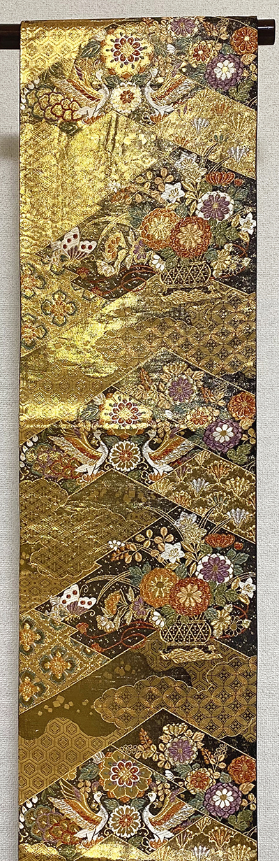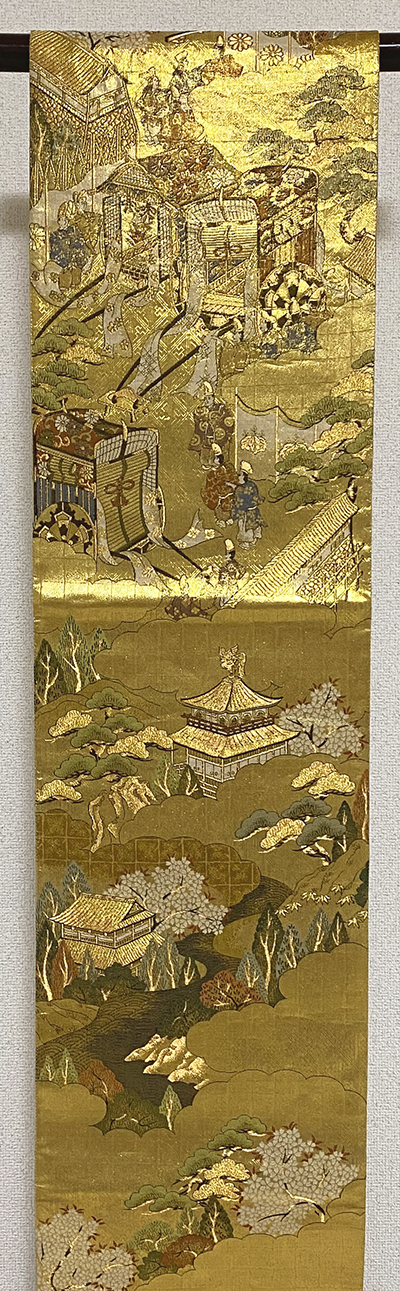 金糸金箔が輝く本金箔の錦の地織りで、京都の都、公家や御所車に山並みの柄などを2種類の金糸金箔と青緑色や黄赤色や白ネズ色などを加え織った品。前腹は別織りになっています。
