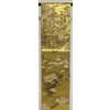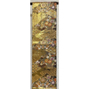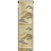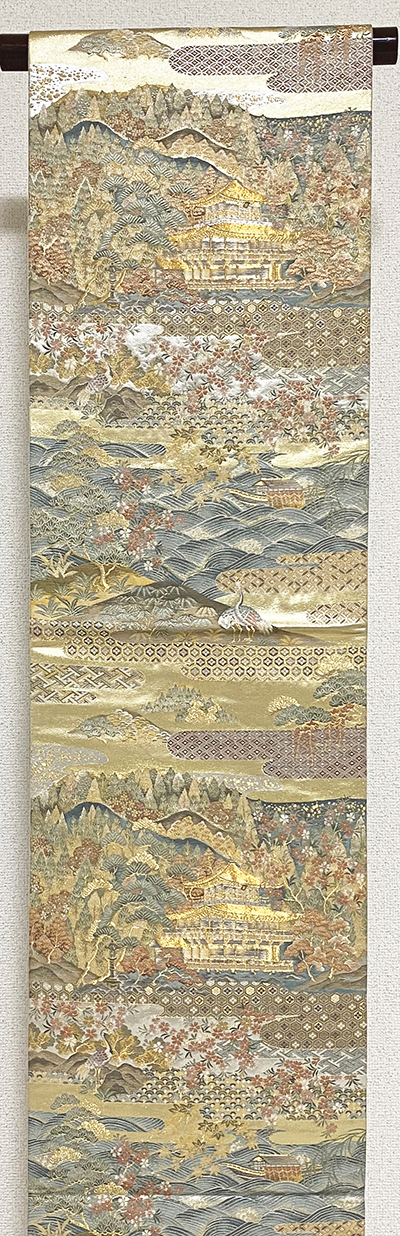 確りとした張りのある本金箔を加えた紹巴織りで、山並みや金閣寺に花鳥柄、波と小舟などの柄を密に織り込んだ上質な品で、金糸金箔と銀糸や青色にこげ茶色とエンジ色などを加えて織った品。