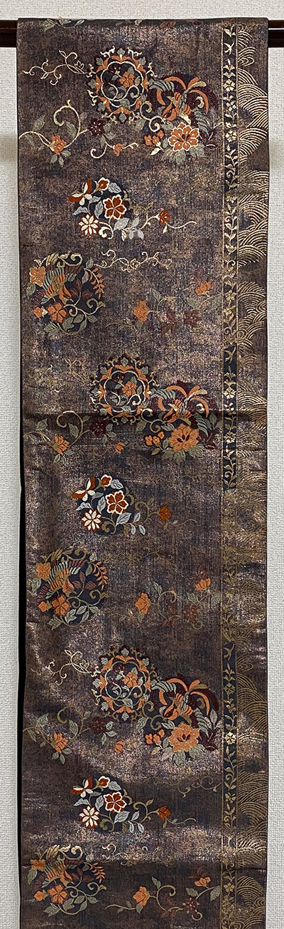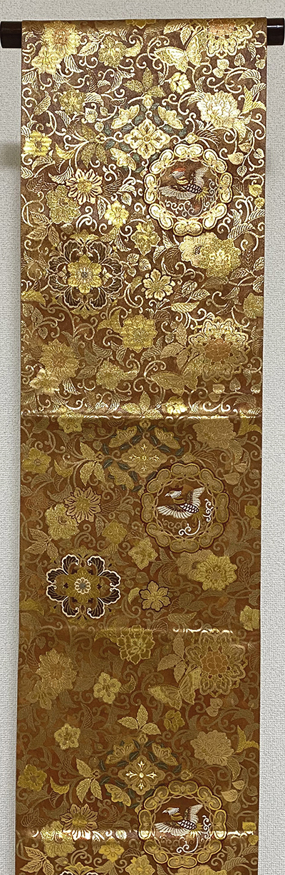 薄手でスベリの良い錦の織りで、海老茶色の地織りに、蔓花と蝶や鳥などの柄を2種類の金糸金箔と少しの青色や紫色などを加えて織った品。